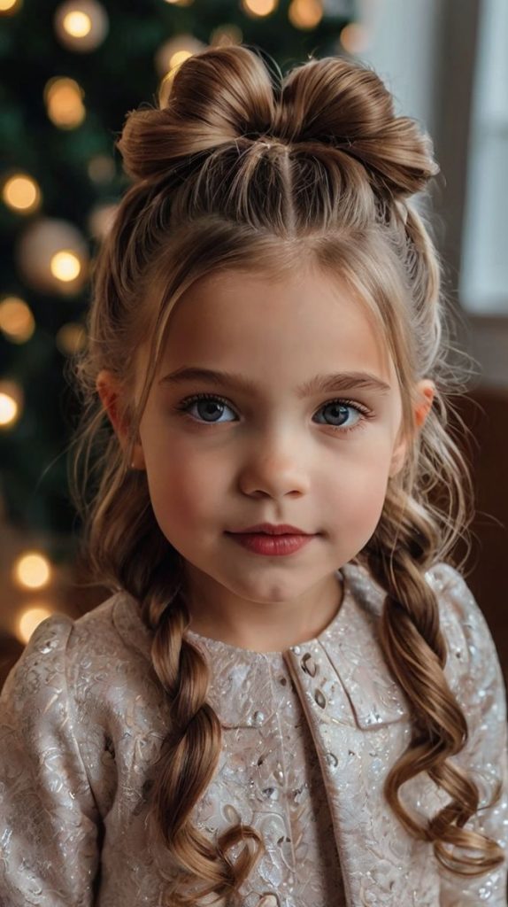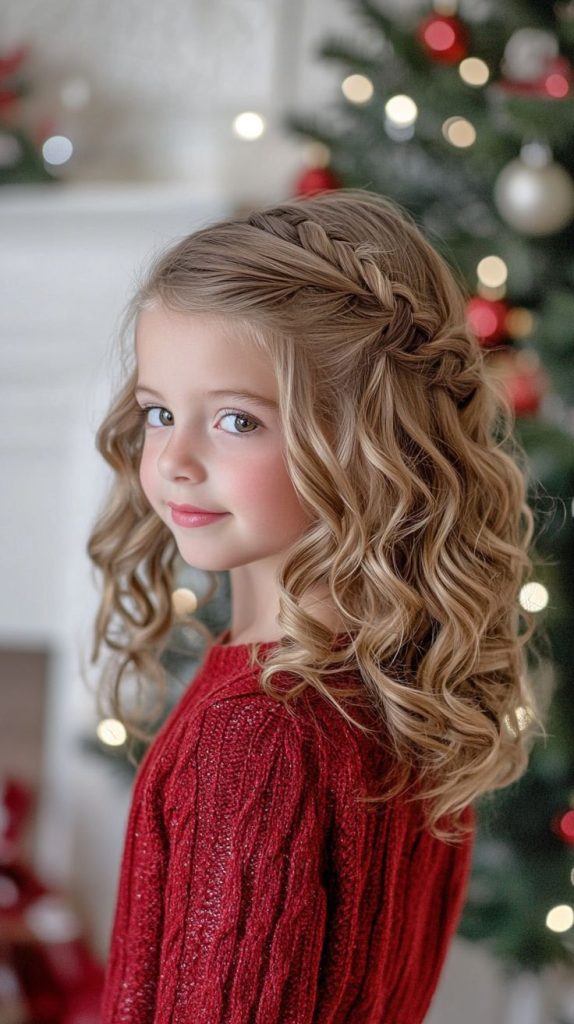 This hairstyle is a festive favorite, with its side braid seamlessly blending into a cascade of bouncy curls. It’s the epitome of elegance and is perfect for holiday events, family gatherings, or even a flower girl moment. The defined curls add volume and movement, making it a standout look.