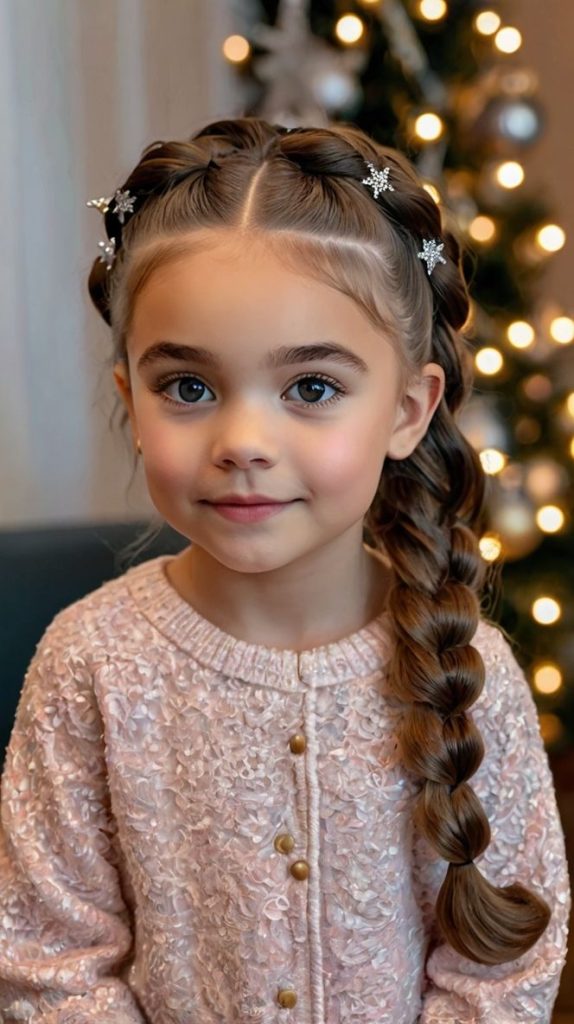 A hairstyle fit for a winter wonderland, this side-swept braid is decorated with delicate snowflake pins, giving it a magical touch. Ideal for holiday celebrations, this look complements cozy outfits and festive dresses. The braid frames the face beautifully while maintaining a neat and elegant appearance.