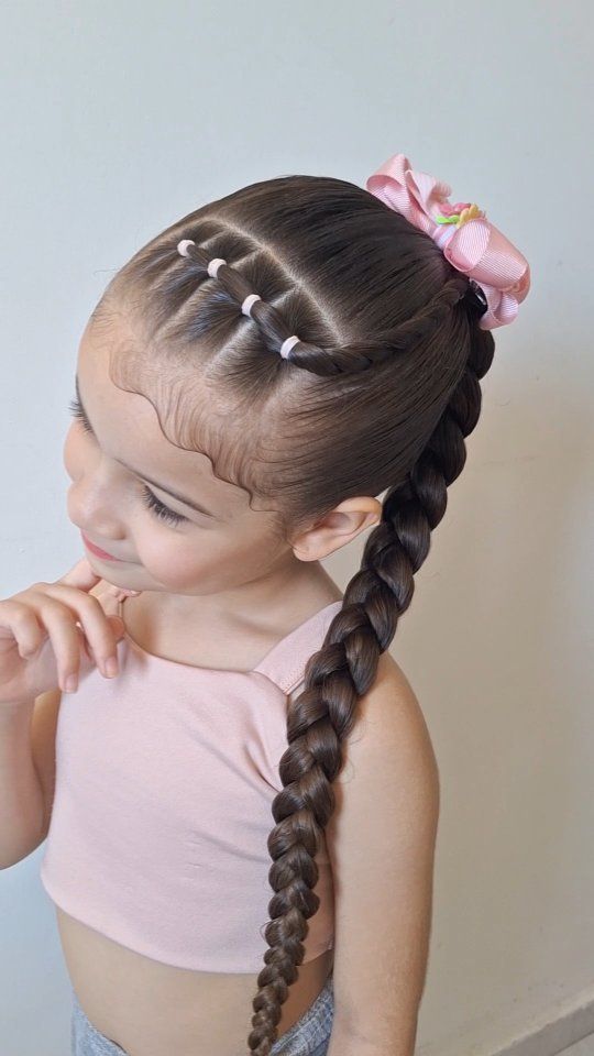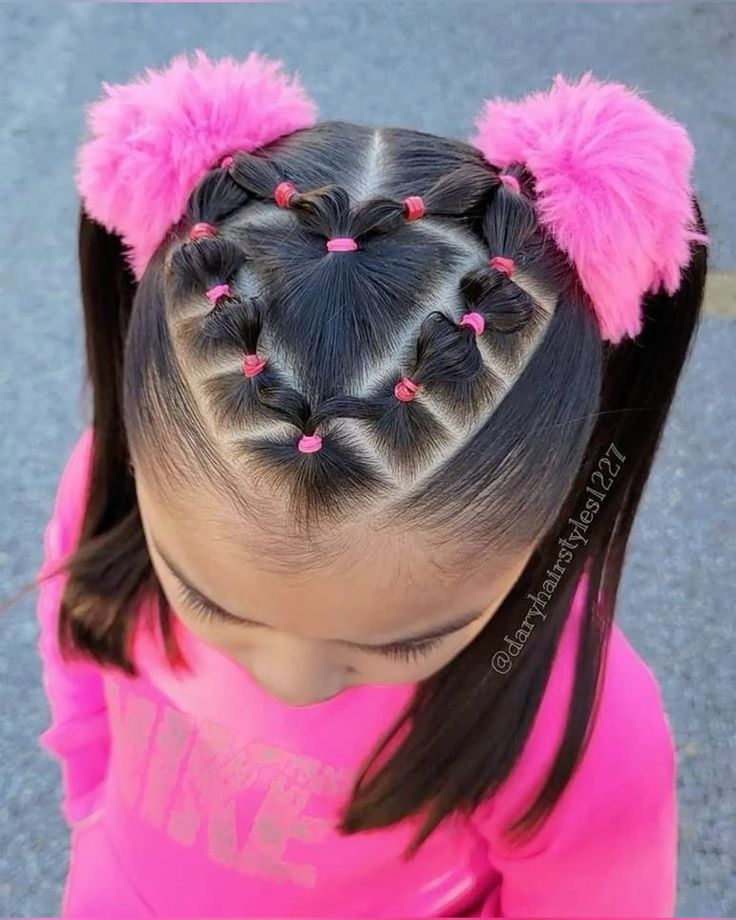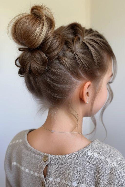 This adorable twin-bun hairstyle combines practicality with charm. Two high buns are styled symmetrically, each adorned with a bright pink bow. The style is both functional and cute, making it ideal for a day at the park, a casual playdate, or even a costume party. It’s a playful hairstyle that keeps hair secure while exuding youthful energy.