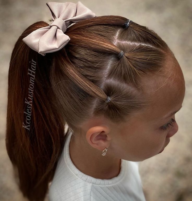 This creative hairstyle features a sectioned ponytail with small elastic bands, topped off with an oversized bow. The sectioning adds texture and uniqueness, making it perfect for birthday parties or family outings. It’s a playful style that’s easy to achieve while looking polished.