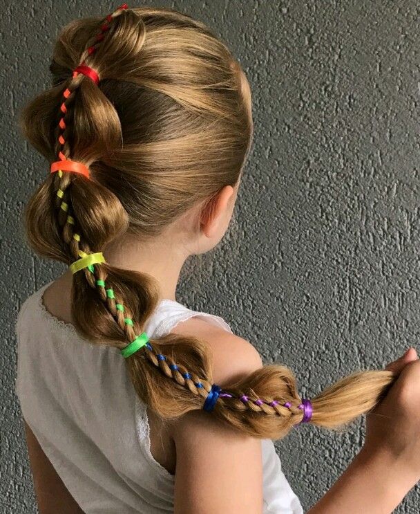 This hairstyle is a burst of color and creativity, featuring a bubble ponytail interwoven with rainbow-colored ribbons. It’s a vibrant and playful look that’s perfect for festivals, parades, or any celebration. The braided accents add a touch of intricacy and charm.