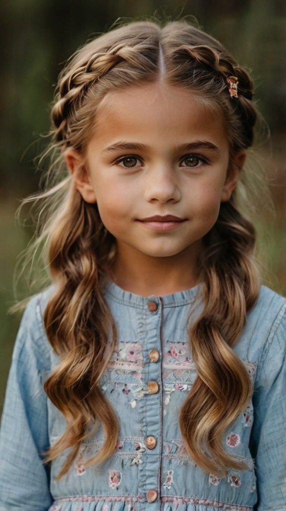 This half-up, half-down hairstyle is a dream for any little girl. Twists on either side meet at the back of the head, forming a soft, romantic look that’s perfect for outdoor events or family photoshoots. The loose waves flowing down the back add an effortless charm, making it ideal for spring or summer festivities. This style works wonderfully with floral dresses and is especially flattering for medium to long hair lengths.