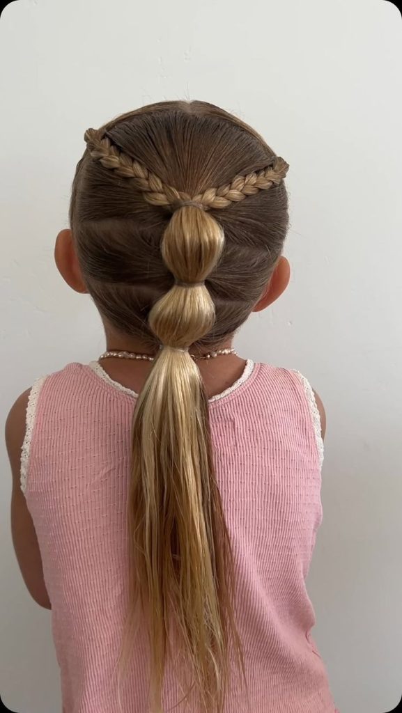 This bubble ponytail features a unique braided accent, combining texture and fun in one look. The hairstyle offers a playful yet polished vibe, perfect for school events or birthday parties. The bubbles add volume and dimension, making this a trendy choice for 2025.