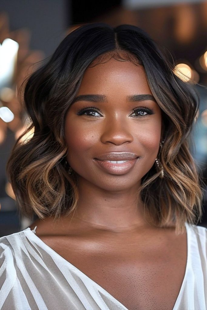 This glamorous wavy bob enhances black hair with a hint of warmth, achieved through subtle highlights. The soft waves add dimension and movement, creating a timeless look that flatters every face shape.