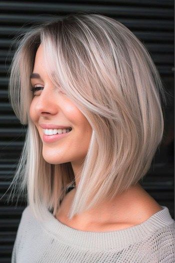 This angled bob is the epitome of modern chic, with cool-toned blonde hues that bring out the best in medium-length hair. The layers at the front frame the face, making this style perfect for round faces.