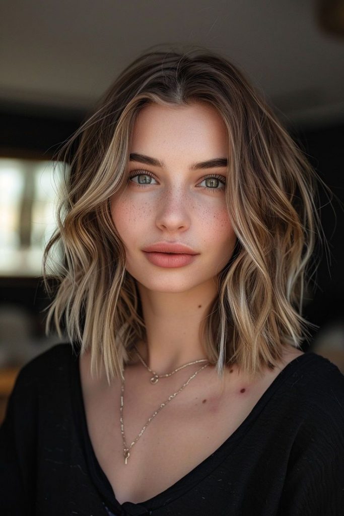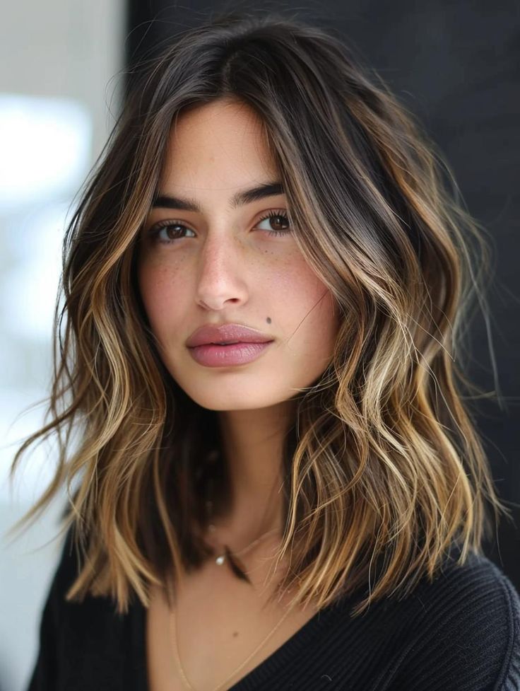 This textured lob features soft waves that give it a playful and relaxed appeal. The natural highlights bring out the depth in the wavy hair, creating a sun-kissed effect. This style is particularly suitable for those seeking a balance between effortless chic and versatility.