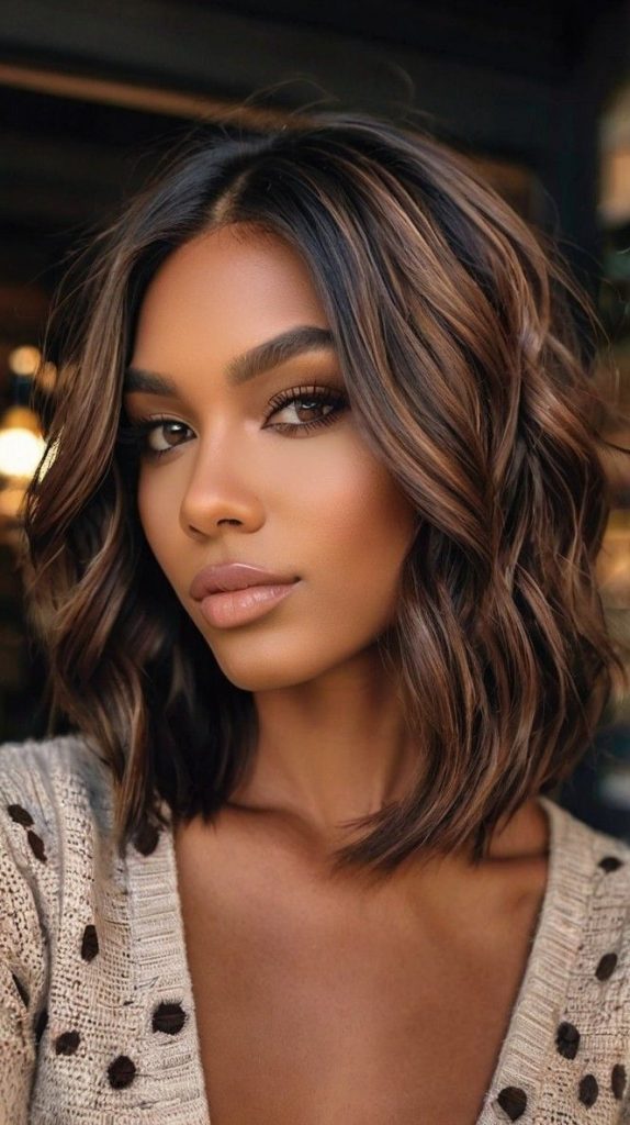 For those who love texture, this wavy hair lob with subtle highlights offers dimension and movement. The mid-length cut enhances natural curls or waves, making it a popular choice for women with naturally textured hair. This look is both playful and versatile, suited for casual outings or more formal settings.