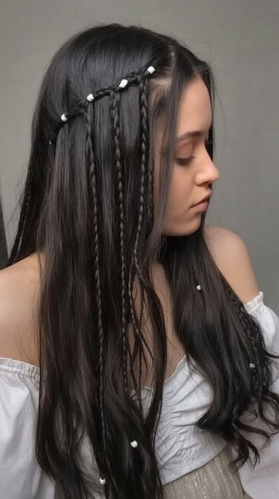 Side part and beads mixed with little braids and the bohemian style bred a very loose yet elegant style. It is playful and can automatically add an artisan, handmade quality to your style.