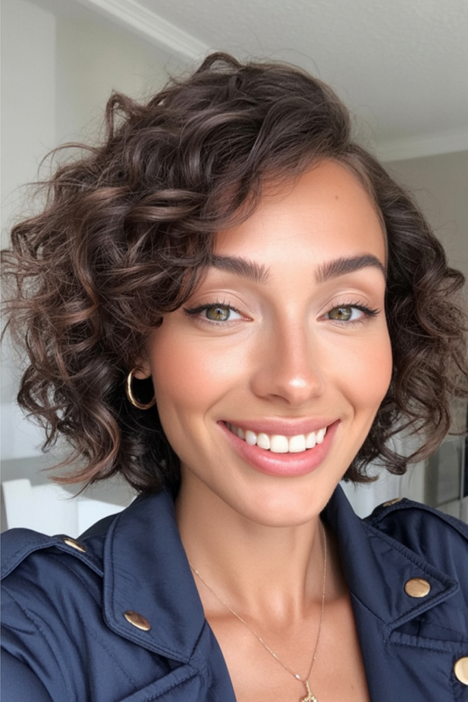 The side part gives out optimism and happiness to this short curly bob. The asymmetry makes it interesting and curls make it lively and bubbly. It is a style which would work equally well at either brunch or an after-hours outing.