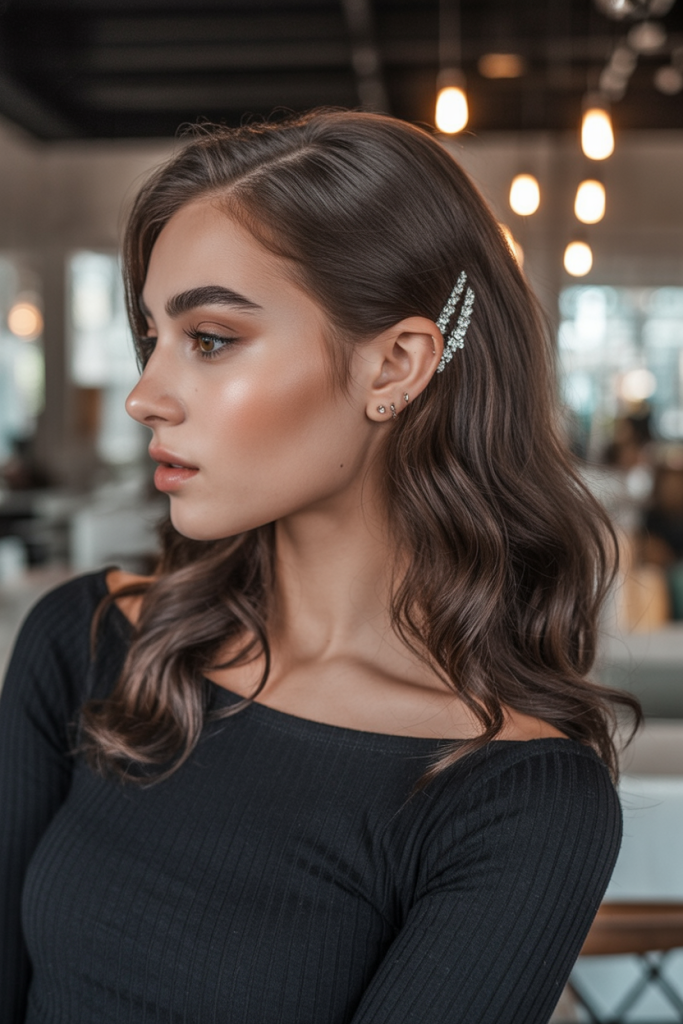 This style is great on longer and thick hair, the waves are ideal when given a gentle outlining through a curling iron. You have to leave the top smooth to focus on part of it and leave the clips to shine out and be the attention. It is a simple upgrade to date nights or family holiday parties.