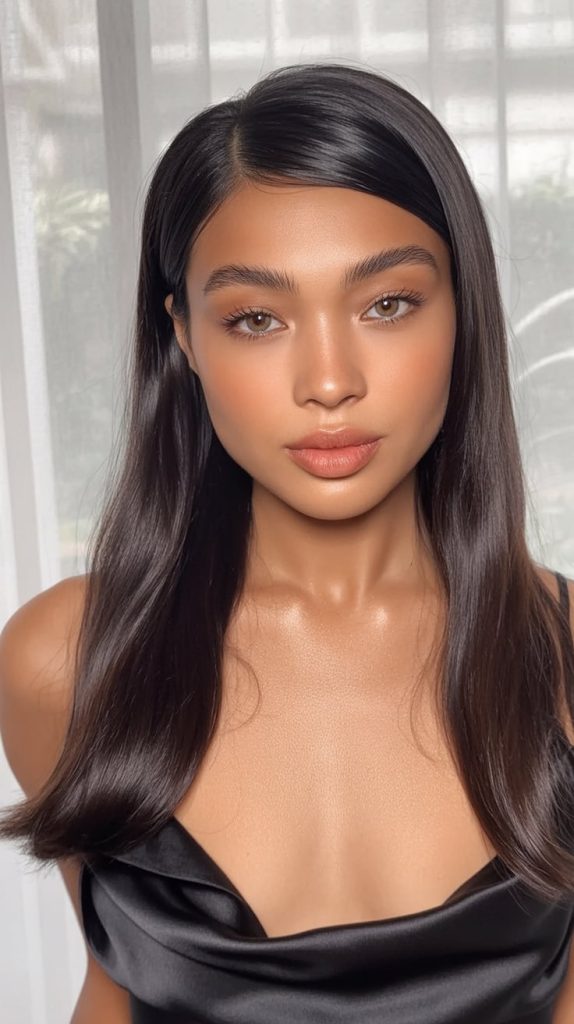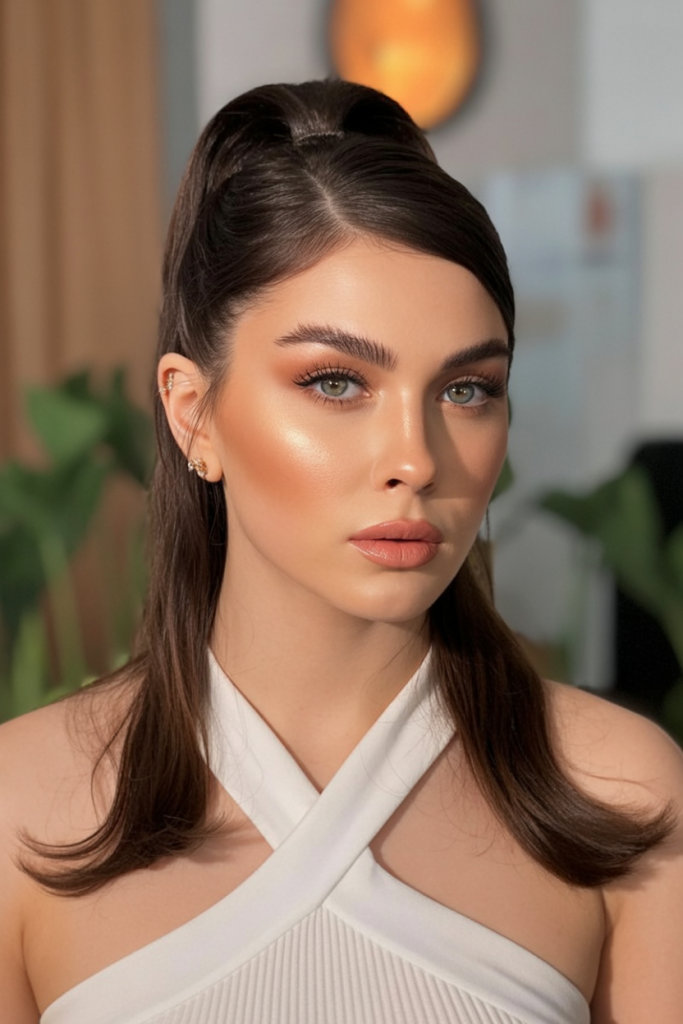 Sleek half-up + a proper side part are something simple and yet graceful. It catches the attention to the top and forms a caressing frame around the face and at the same time a bit of elegance without being pushed. This style checks that classic box and is something you can dress up to a night out or even a classy lunch date and feel instantly put together.