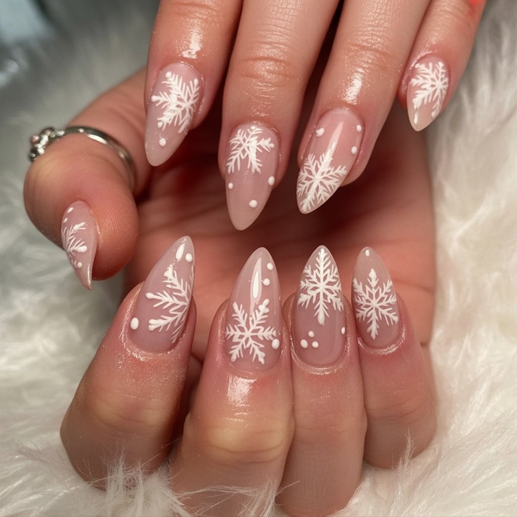 Barely-there nude meets delicate white flakes in this understated design. The transparent base allows the snowflake lines to float softly, giving an airy, elegant impression that’s perfect for subtle Winter glam.