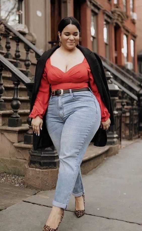 This striking outfit features a bold red top with a sweetheart neckline, perfectly paired with light-wash jeans. The top adds a pop of color and accentuates the curves, making it an ideal choice for both casual and work settings. The light-wash jeans offer a comfortable fit, while the black coat draped over the shoulders adds a sophisticated touch. Leopard print heels complete the look, adding a playful yet chic element. This ensemble is perfect for women with a big stomach who want to look stylish and feel confident.