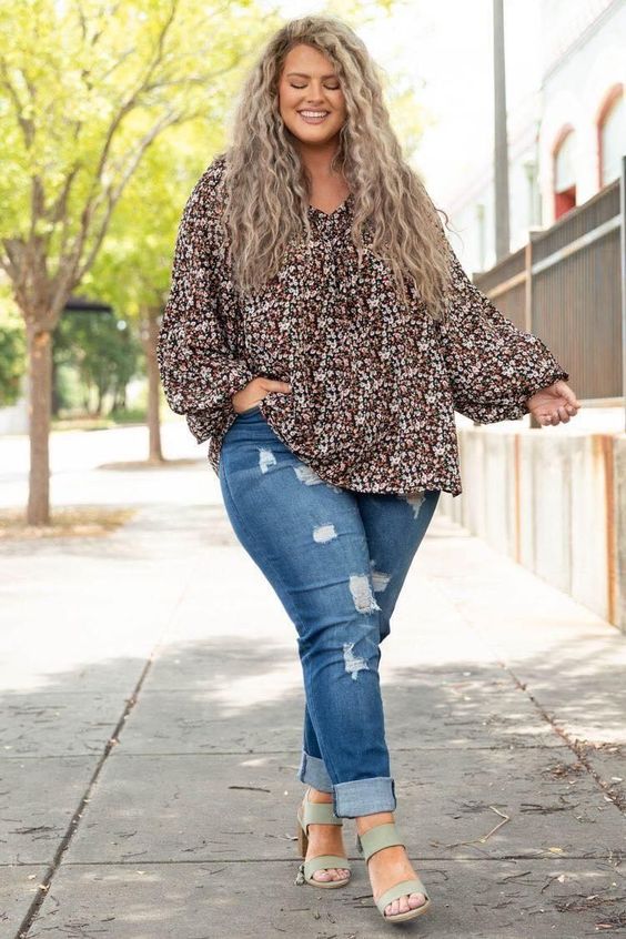 A flowy floral blouse paired with distressed jeans creates a relaxed yet stylish look. The loose fit of the blouse is perfect for casual days, offering comfort and ease of movement. The distressed jeans add a trendy element, making this outfit ideal for casual outings. Sandals complete the look, adding a touch of summer to the fall fashion.