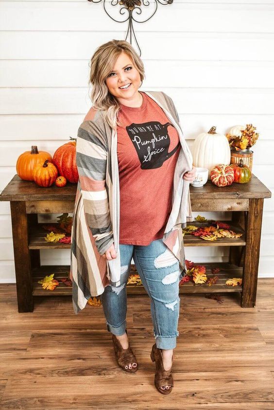 Celebrate fall with this pumpkin spice graphic tee paired with a striped cardigan and distressed jeans. The graphic tee adds a fun element, while the cardigan keeps you warm. This outfit is perfect for casual outings and fall festivities. Complete the look with peep-toe booties for a trendy touch.