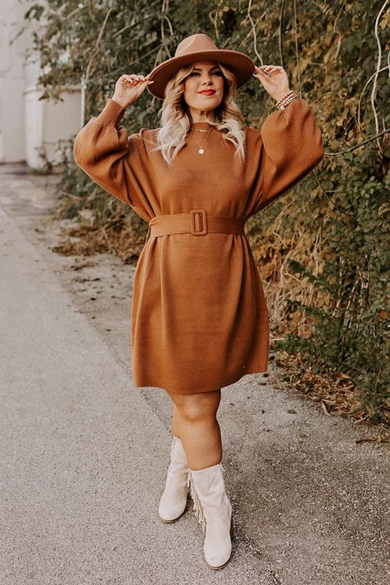 A chic camel dress paired with a belt and hat creates a sophisticated fall look. The dress’s warm color is perfect for the season, while the belt accentuates the waist. The hat adds a stylish touch, making this outfit ideal for both casual and formal occasions. Pair it with white boots for a complete look.