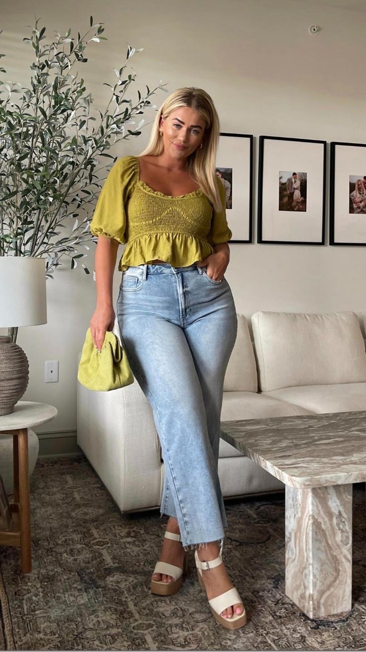 19. Green Blouse with High-Waisted Jeans