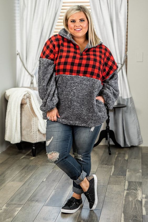 Stay warm and stylish with this plaid and fleece hoodie. The red and black checkered pattern combined with a cozy fleece bottom makes this hoodie a must-have for casual fall days. Paired with distressed jeans and sneakers, this look is perfect for running errands or casual meet-ups. It’s an excellent choice for those seeking casual leggings outfits.