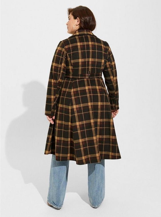 A stylish plaid trench coat paired with flared jeans creates a chic and modern fall look. This outfit is ideal for work, offering a professional yet trendy appearance. The trench coat adds structure, while the flared jeans balance the look, making it suitable for women with a big stomach. This ensemble is perfect for big stomach work attire.