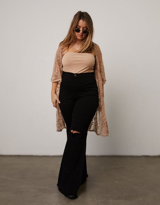 This boho-inspired outfit features a lace kimono paired with high-waisted black jeans. The kimono adds a feminine touch, while the high-waisted jeans offer a flattering fit. This look is perfect for casual settings and can easily transition from day to night.