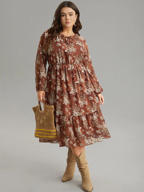 A charming brown floral dress that pairs beautifully with ankle boots. The dress’s loose fit and floral pattern make it ideal for fall, offering both comfort and style. This outfit is great for casual outings and can be dressed up or down depending on the occasion.