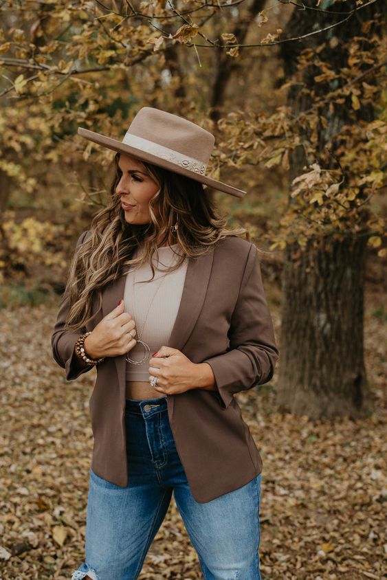 A sleek blazer paired with jeans creates a smart casual look perfect for work or a casual day out. The blazer adds a professional touch, while the jeans keep the look relaxed. This ensemble is versatile and can be styled with different tops and accessories.