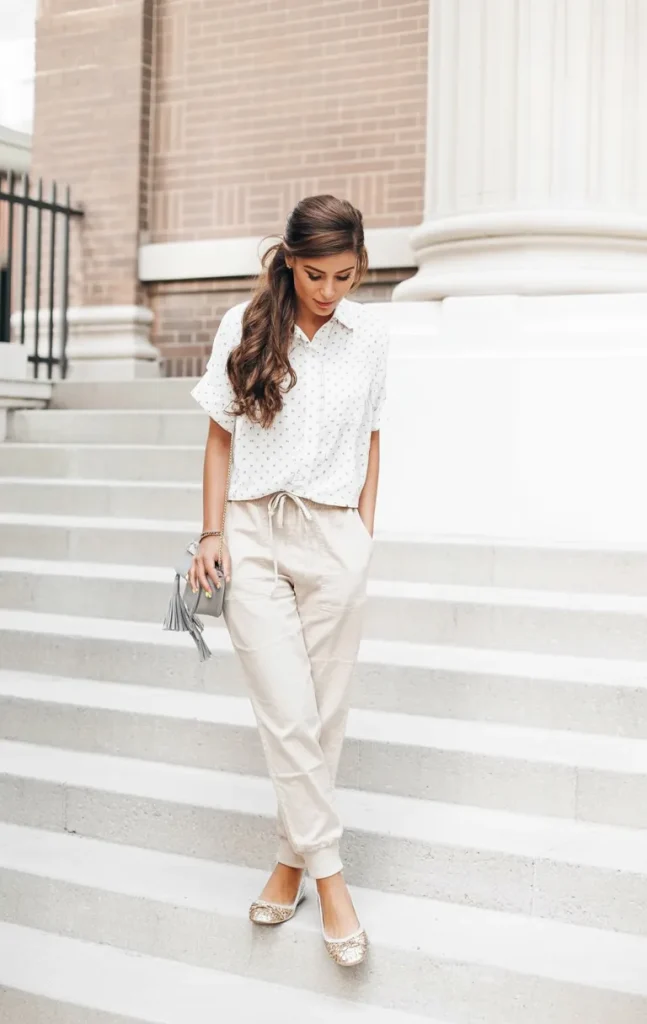16. White Blouse and Beige Jogger Pants
