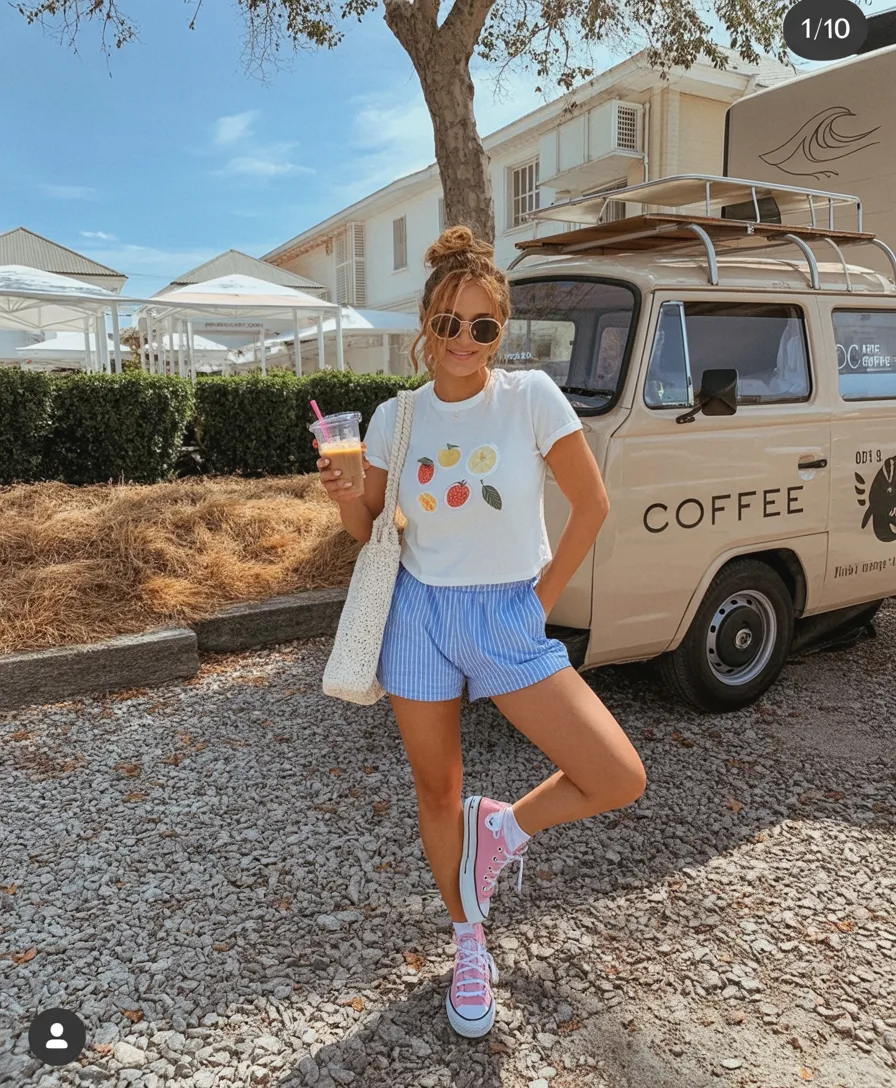 This one is pure sunshine in outfit form. The playful graphic tee, breezy striped shorts, and cheerful pink sneakers create a look that feels fun, youthful, and completely unbothered in the best possible way. It has that spontaneous summer charm that makes you want to grab a cold drink, head out early, and stay out longer than planned. There’s a slight baddie edge here too, but in a sweet and approachable way rather than anything overly styled. What I love most is how relaxed it feels while still looking intentional. This is exactly the kind of Cute combo that gives casual dressing personality, and it fits beautifully into the cheerful side of summer casual outfits 2026.