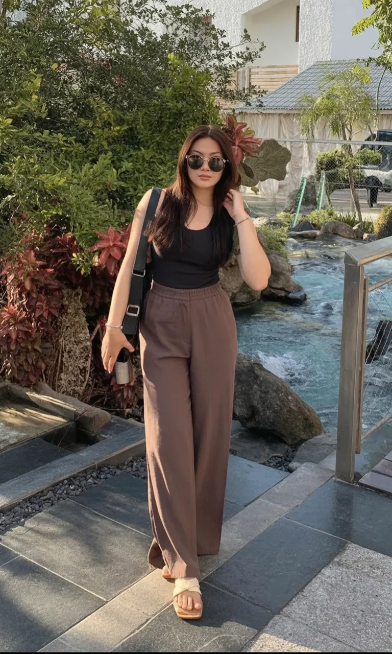 10. Black Tank and Wide-Leg Brown Pants