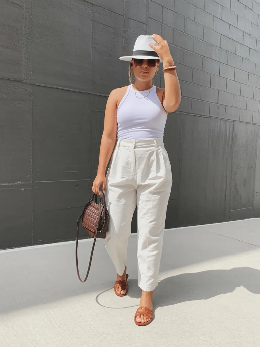 This outfit is crisp, clean, and undeniably Classy. The white-on-white palette always has a way of looking more expensive than it really is, and here it feels especially striking with the fitted halter tank and tailored pleated trousers. There’s a beautiful strength to this kind of simplicity. It doesn’t rely on prints or loud accessories; it just lets cut, shape, and confidence do the work. Add the structured hat and warm-toned sandals, and the whole thing feels polished enough for brunch, vacation dinners, rooftop drinks, or even a more elevated day in the office. If you’re building a list of summer casual outfits for 2026 that feel grown-up and Chic, this one belongs near the top.