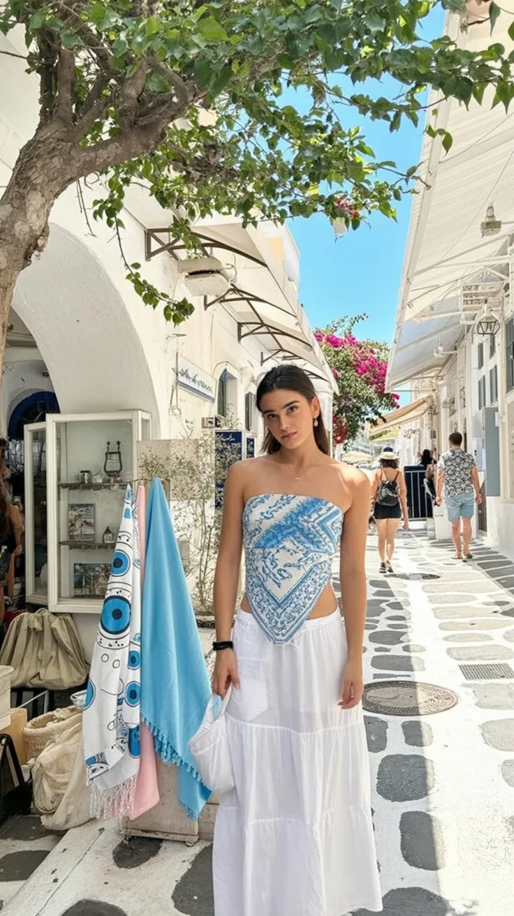 The vibe here is confident, feminine, and just a little bit daring. A scarf top gives a more fashion-forward feel than a standard tank, but the long white skirt keeps everything balanced and wearable. This could be a lovely choice for vacation dinners, resort walks, outdoor parties, or any day when you want to feel special without wearing a formal dress. Keep the accessories light and let the blue-and-white palette shine. Compared with a typical crop top and skirt combination, this feels more elevated and more memorable. For women who enjoy trying new ideas while staying elegant, this is a standout 2026 women’s look.