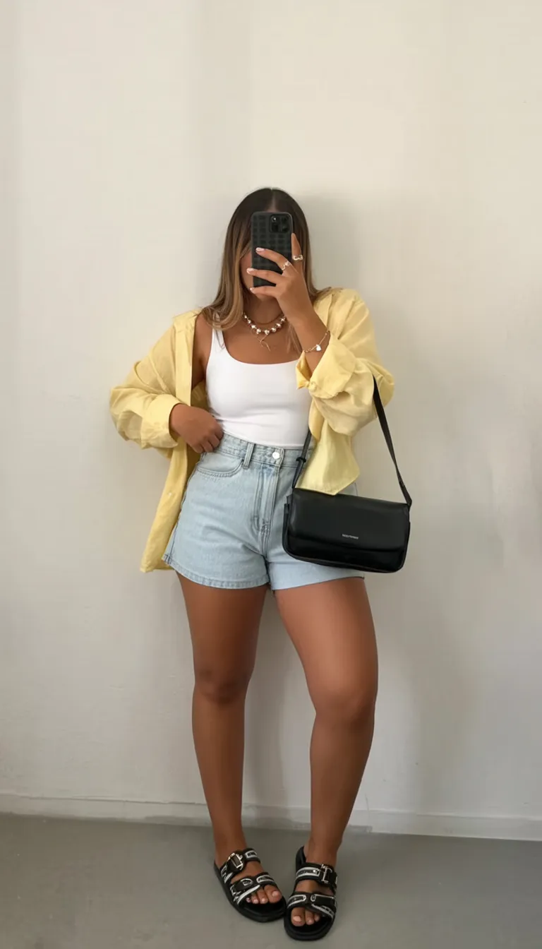 There’s something instantly cheerful about this outfit, like sunshine in clothing form. The pale yellow overshirt softens the whole look and gives it that relaxed, optimistic feel that belongs to the best summer mornings. Paired with a white tank and light denim shorts, it feels easy, Cute, and refreshingly uncomplicated. It’s the sort of combo that doesn’t ask much of you but somehow still makes you feel styled and put together. I love outfits like this because they remind you that summer style can be playful without becoming childish. In the world of summer casual outfits in 2026, this has that sweet aesthetic that feels bright, wearable, and very now.