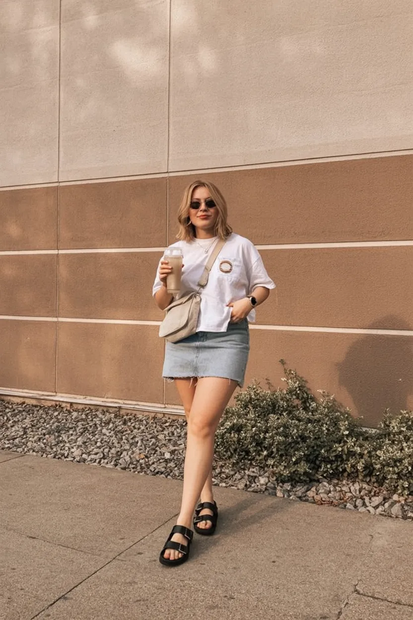 This outfit is proof that the classics still know how to work. A crisp white tee with a denim mini skirt has that all-American ease, but here it feels updated in a really wearable way for summer casual outfits in 2026. It’s unfussy, approachable, and has that cool-girl energy that doesn’t depend on trendy extras. You could wear this for coffee, a casual lunch, a walk around town, or one of those ordinary days when you still want to feel cute and pulled together. The crossbody bag and chunky sandals add just enough personality to keep it from feeling plain, and that’s exactly why this look lands so well. It’s simple, but not forgettable.