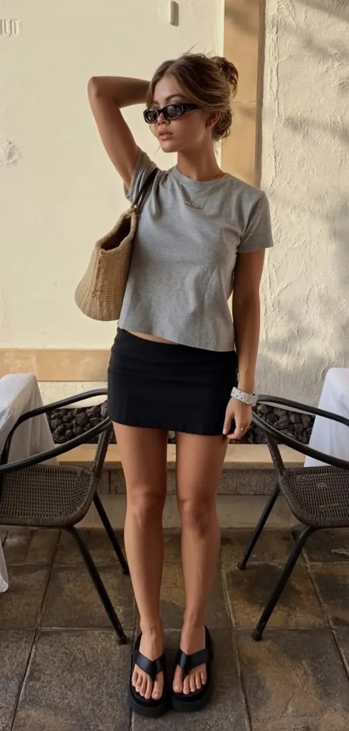 This outfit has that sleek, slightly mysterious energy that makes even the simplest pieces feel elevated. A fitted gray tee and black mini skirt might sound minimal, but together they create a look that feels sharp, modern, and just confident enough to turn heads without saying a word. It’s giving late-afternoon dinner plans, city heat, and that polished-casual mood that’s become such a big part of summer-casual outfits in 2026. The woven shoulder bag and dark sunglasses keep it from feeling too plain, while the clean lines make it feel almost editorial. If you love a capsule wardrobe moment with a little edge, this one absolutely belongs on your list.