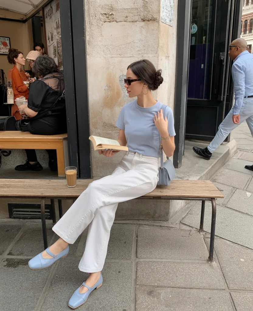 This look feels like a quiet little luxury moment in the middle of an ordinary day. The powder blue tee brings in that Soft, polished charm, while the white trousers make everything feel cleaner, lighter, and just a touch more Euro. It has the kind of understated beauty that doesn’t need loud accessories or complicated layers to make an impression. You could wear this to a café, a museum, a casual lunch, or one of those days when you want to feel effortlessly composed without drifting into anything too dressy. For summer casual outfits in 2026, this is exactly the kind of outfit that whispers style instead of shouting it, and honestly, that confidence always lands better.