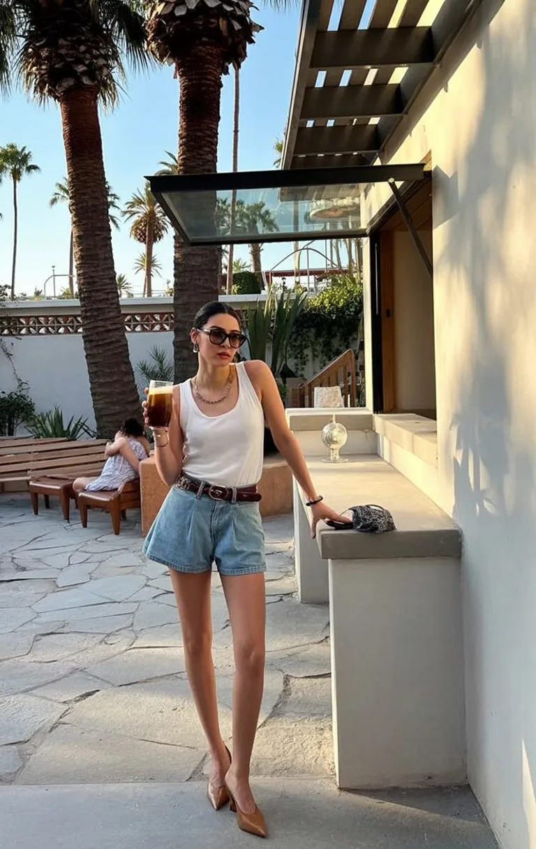 This outfit is such a smart little reminder that casual doesn’t have to mean flat or forgettable. A white tank and denim shorts are about as classic as it gets, but the belt, pointed heels, and dark sunglasses completely shift the mood into something sharper and more fashion-aware. Suddenly, what could have been a basic daytime look feels sleek, grown-up, and even a little glamorous. It’s giving polished summer evenings, patio cocktails, and that slightly elevated energy that makes you feel more put together than the occasion even requires. In the lineup of summer casual outfits for 2026, this one stands out because it plays with contrast so well.