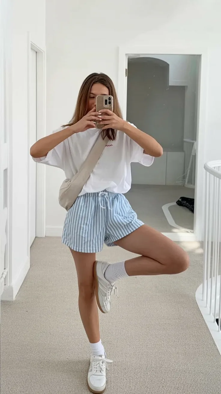 This is the kind of outfit that instantly feels fresh, light, and ready for a real-life summer day. The oversized white tee keeps things relaxed, the blue striped shorts add that playful pajama-inspired charm we keep seeing everywhere, and the white sneakers tie it all together in a way that feels sporty and easy. There’s a sweet, casual confidence to this look that makes it so appealing. It doesn’t try to be glamorous, and that’s exactly why it works. For summer casual outfits in 2026, this is one of those ideas that feels especially relevant because it blends comfort, simplicity, and personality without any extra drama.