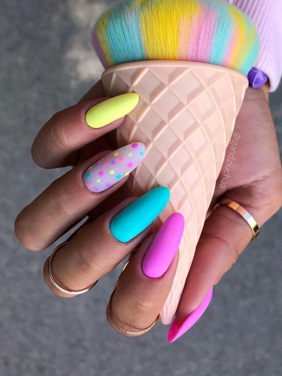 Polka dots are fun, trendy, and easy to customize. They add a playful touch to summer nails colors almond shape or any other shape.