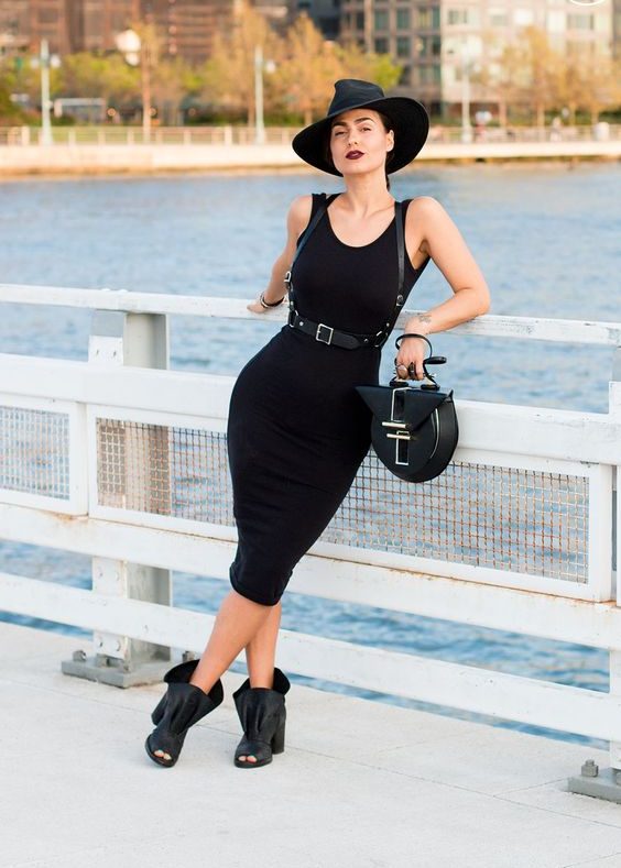 Starting strong, this outfit combines a classic summer goth outfit with an urban twist. The sleek black dress with a subtle slit is perfect for warm weather, offering breathability and style. Accessorized with a wide-brimmed hat and a pair of comfortable yet edgy boots, this look is a staple for a summer goth ensemble.