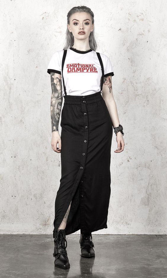 This look is for the minimalist goth. A crisp, white graphic tee tucked into a high-waisted black skirt creates a sleek silhouette, while the suspender details add a punk flair. Perfect for those who appreciate a summer goth outfit casual with an edge.