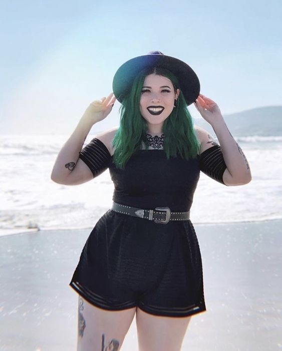 Who says goth can’t go to the beach? This outfit features a breezy romper perfect for the seaside, styled with a wide-brimmed hat and a statement belt. The playful yet dark look proves that summer goth outfits can be both cute and cool.