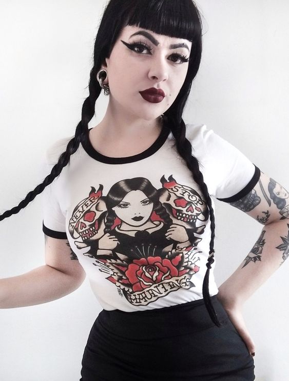 A throwback to the rockabilly roots of goth, this look combines a graphic ringer tee with a classic black skirt. The dual braided pigtails and bold lipstick echo the vintage vibes, making it an outfit that stands out in any summer goth wardrobe.