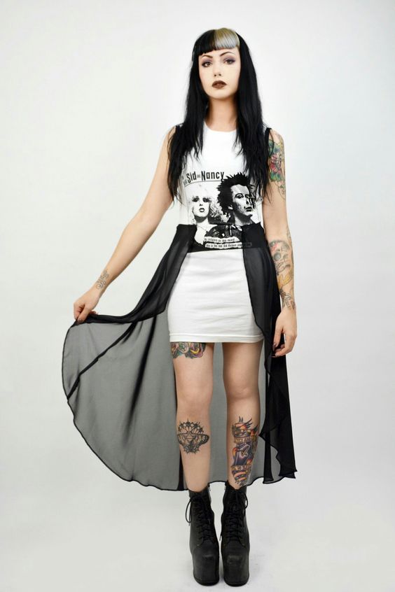 A white graphic tank dress under a sheer black long cardigan offers a playful yet punk-inspired look. It’s the kind of outfit that could take you from a casual daytime gathering to an underground evening concert with ease.