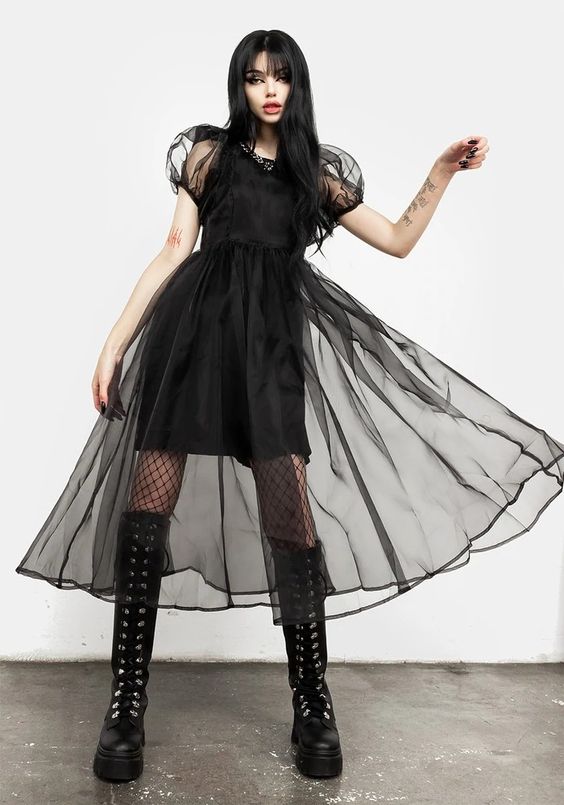 This look is a gothic fairytale come to life. The sheer, puff-sleeved dress paired with a velvet bodice and platform boots is reminiscent of a modern-day goth princess. The airy fabric makes it a comfortable choice for warmer weather.