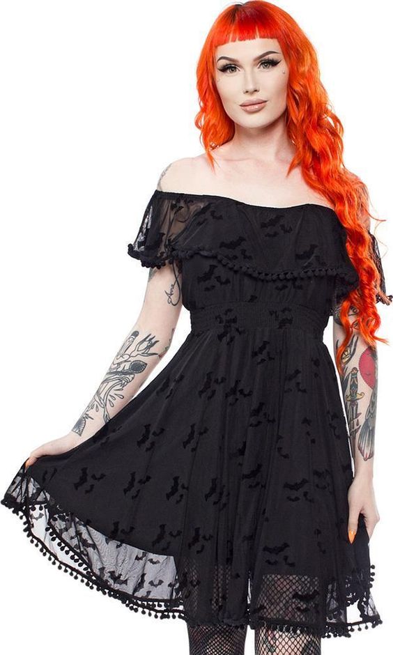 The final outfit of our list is a stunning black lace dress with playful bat motifs. The off-shoulder design and delicate details make it a perfect choice for those warm, whimsical summer nights.