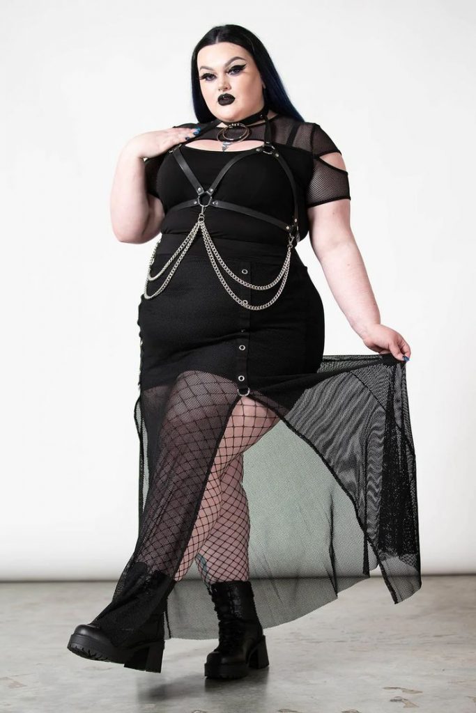 Highlighting summer goth outfits plus size, this outfit is a beautiful showcase of how gothic fashion embraces all sizes. A mesh top paired with a skirt and platform boots offers a flattering silhouette. The added chains give a nod to goth’s love for metalwork and accessories.