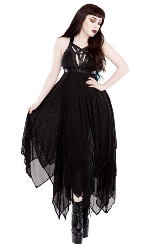 A blend of gothic and chic, this midi dress with harness detailing encapsulates a sophisticated yet edgy vibe. The platform boots and fishnet tights bring a bit of punk rock into an otherwise polished look, ideal for those who want to mix summer goth outfits aesthetic with a hint of rebellion.