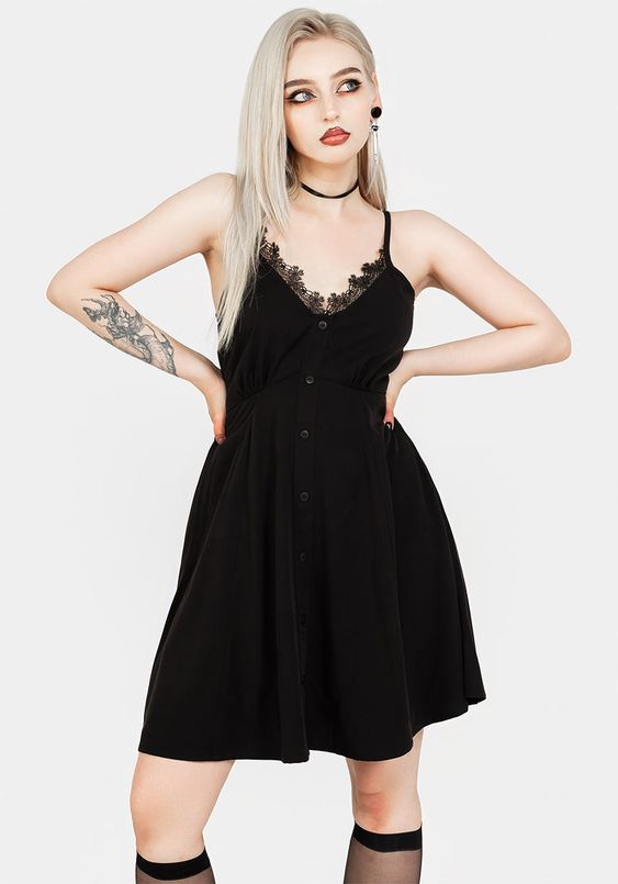 Looking for a summer goth outfit casual option? This one is perfect. The dress is simple, lightweight, and breathes well, making it ideal for a summer day. The delicate lace detailing adds a feminine touch to the classic black.