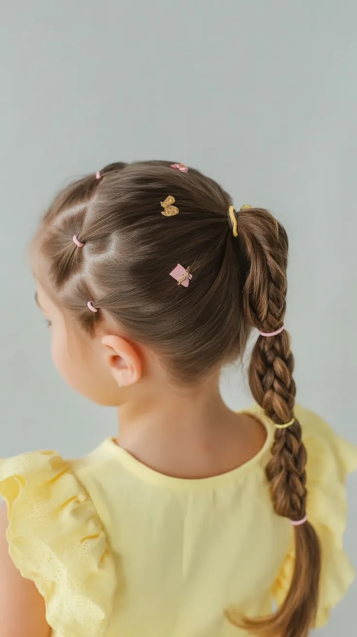 This style has a gentle energy that feels cheerful and light. The braid flowing into a ponytail gives it structure, while the tiny butterfly clips add movement and playful detail—perfect for kids who love little surprises in their hair.
