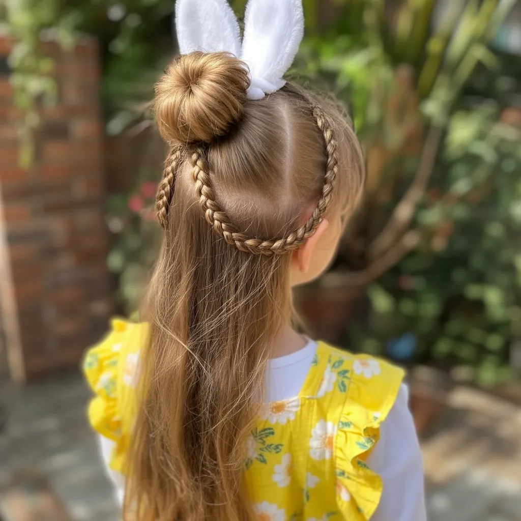 This hairstyle is pure Easter fun. The wrapped braids leading into a neat bun create structure, while the bunny ears accessory makes it playful and memorable—exactly what kids love about holiday looks.